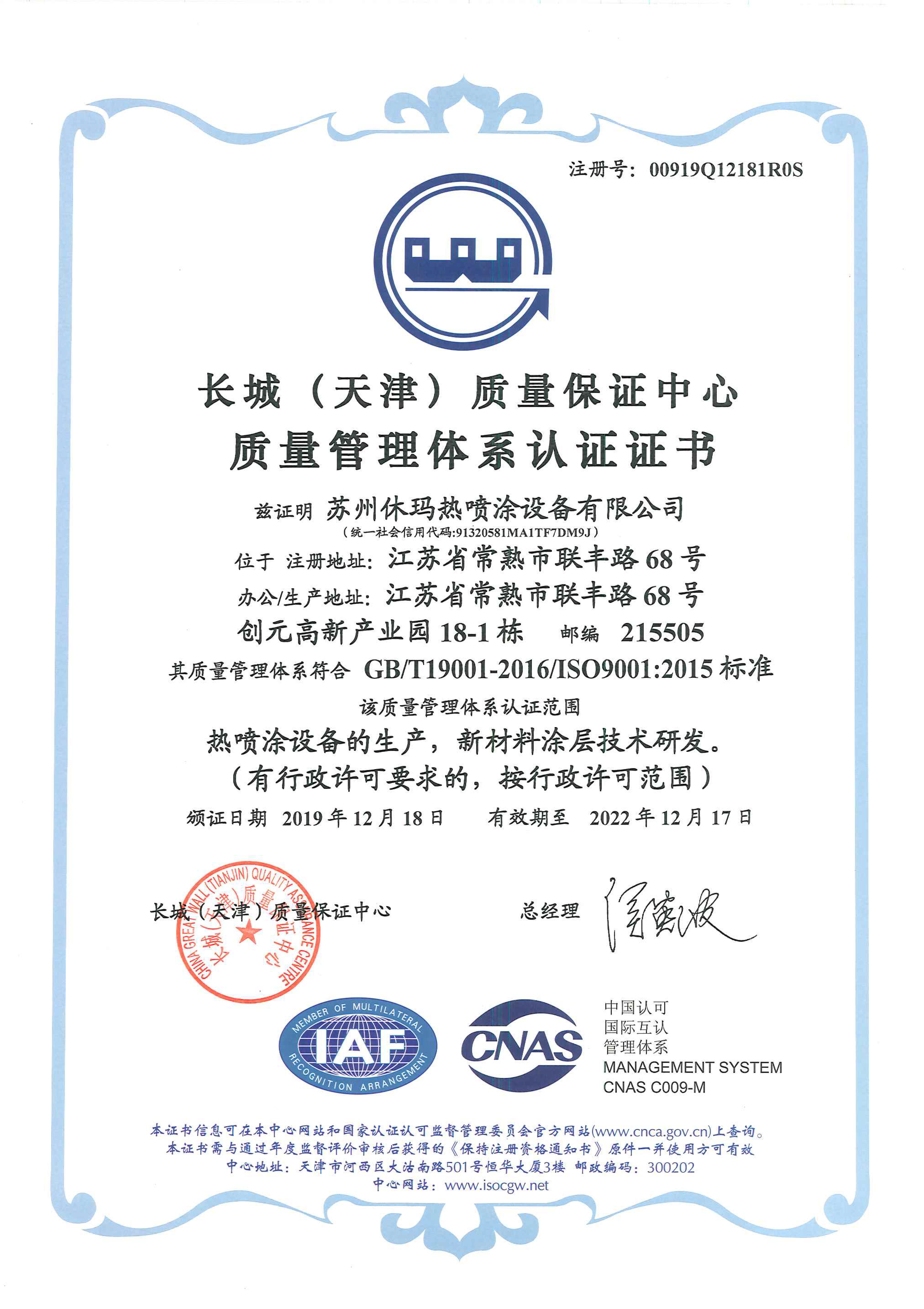 2020年我司注册成功ISO证书